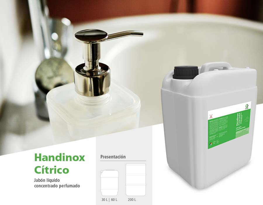 Handinox Cítrico fue desarrollado para ofrecer al mercado un limpiador para sus manos y su piel totalmente seguro y eficaz. Su gran poder penetrante hace que disuelva fácilmente: grasa, carbón, tinta y suciedad en la piel. Handinox Cítrico es fácil de usar y trabajar instantáneamente, dejando la piel suave y limpia. Produce una rica espuma con un excelente enjuague. Además esta enriquecido con un sobre engrasante para lubricar la piel. No contiene solventes, ni cáusticos que dañan la piel, tiene un agradable y suave aroma de limpieza y frescura.