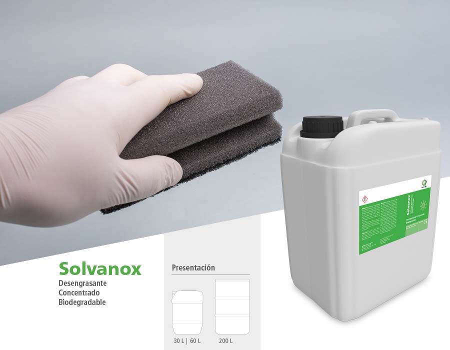 Solvanox es un desengrasante concentrado que limpia grasa, mugre, manchas de aceite, tintes, cera moho y otras manchas de cualquier superficie lavable. Limpia las franjas blancas de neumáticos, suelos, paredes, mesas, regaderas, mugre, grasa de cañería, conductos, tubos y cualquier otra superficie lavable. Puede ser usado como un removedor de cera de piso.